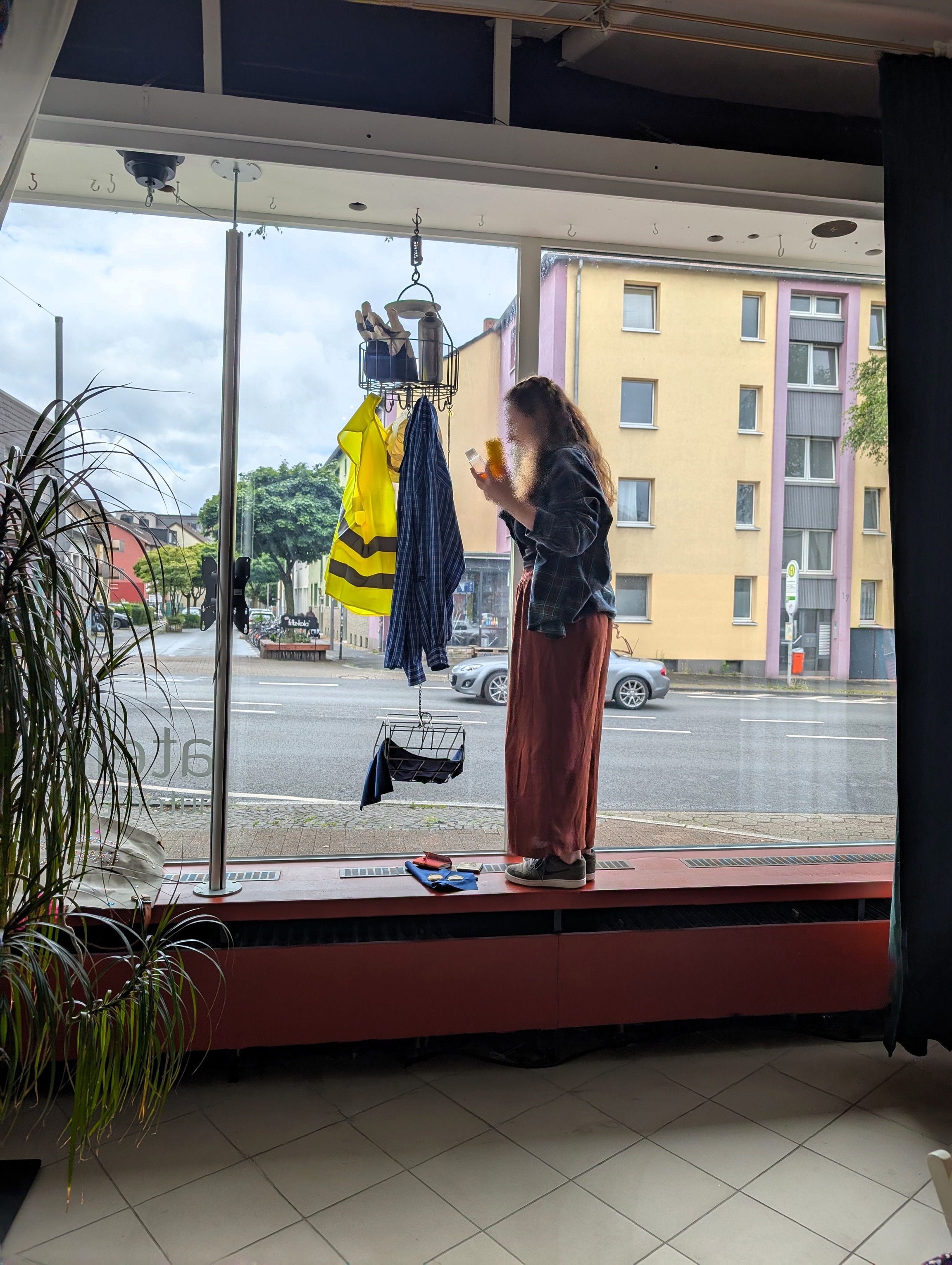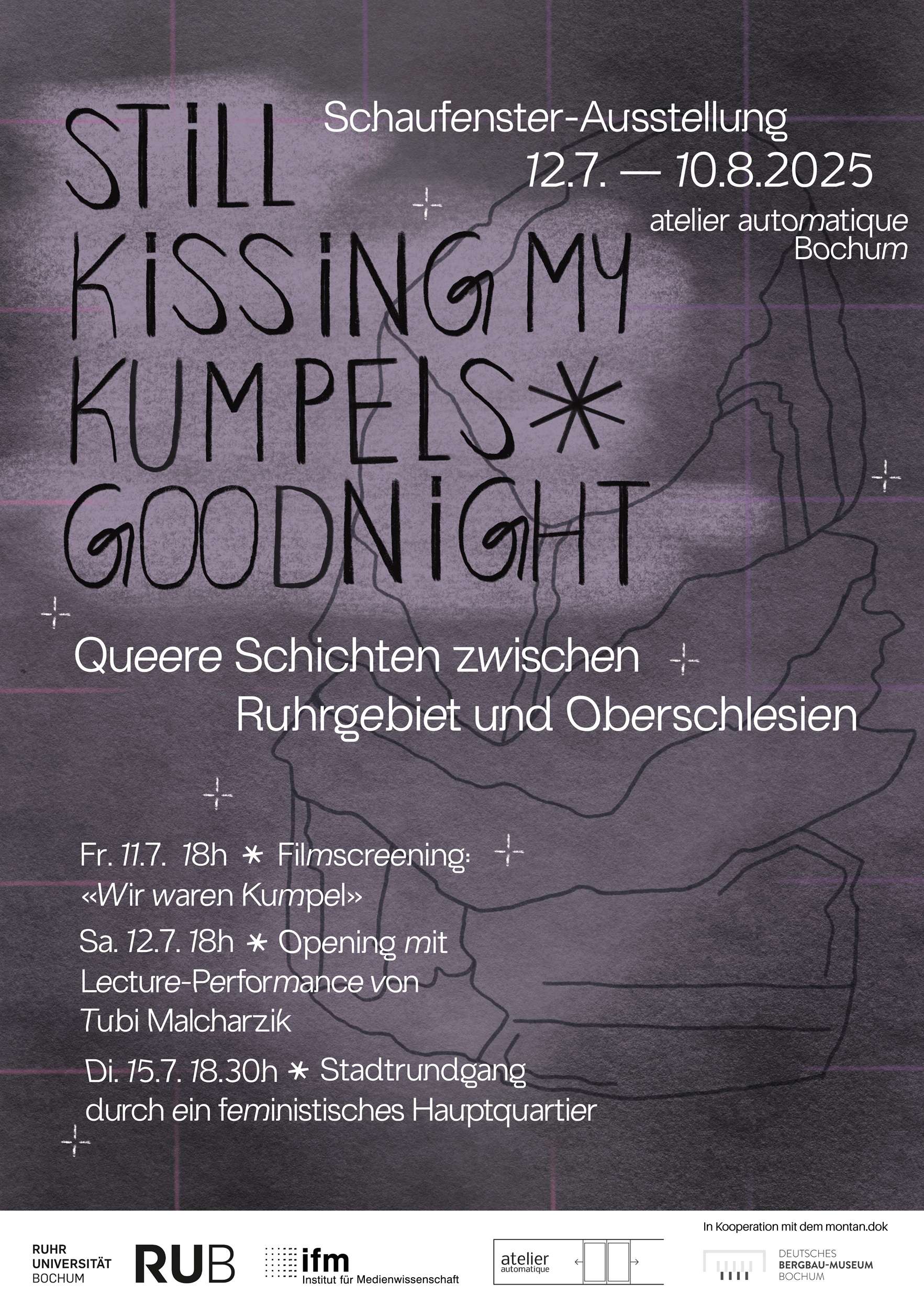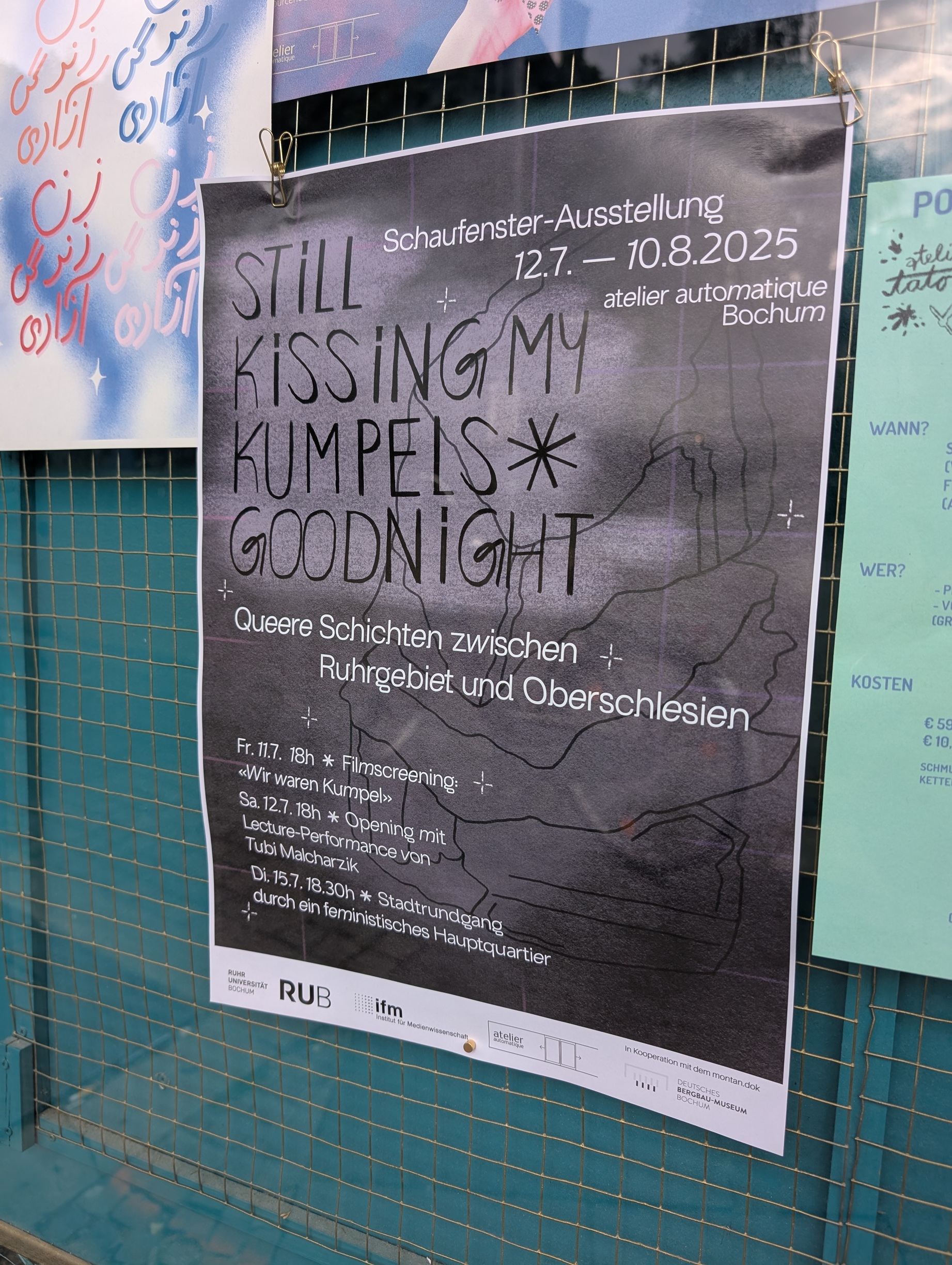 Gemeinsam kuratieren wir die Präsentationen der medialen Exponate als Ausstellung. Die Ausstellung «Still Kissing My Kumpels* Goodnight. Queere Schichten zwischen Ruhrgebiet und Oberschlesien» in den Schaufenstern des Kunst- und Kulturraums «atelier automatique» macht die Ergebnisse der Forschungsprozesse der Öffentlichkeit über einen Zeitraum von 4 Wochen zugänglich (12.07. – 10.08.2025). Ein Rahmenprogramm mit Film-Screening von «Wir waren Kumpel», eine Lecture-Performance von Tubi Malcharzik, die Ausstellungseröffnung, und einen «Stadtrundgang durch ein feministisches Hauptquartier» mit Eva Busch und Julia Nitschke begleitet die Ausstellung.
