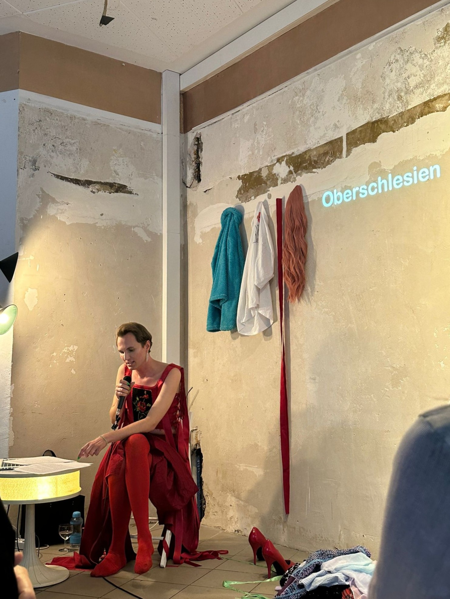 Gemeinsam arbeiten wir dabei mit am Forschungsprojekt der Performancekünstlerin Julia Nitschke, die in ihrer recherchebasierten Praxis zu politischen Erinnern von Vergangenheit, sowohl in queer/feministischen als auch in familiären Post-Ost-Kontexten, zu Migrationsgeschichten und postindustriellen Relationen zwischen Ruhrgebiet und Oberschlesien forscht.